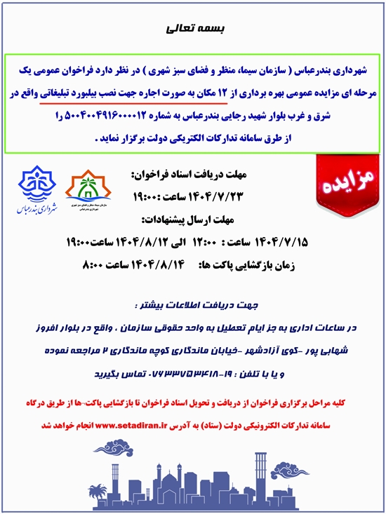 شهرداری بندرعباس) سازمان سیما، منظر و فضای سبز شهری( در نظر دارد فراخوان عمومی یک مرحله ای مزایده عمومی بهره برداری از 12 مکان به صورت اجاره جهت نصب بیلبورد تبلیغاتی واقع در شرق و غرب بلوار شهید رجایی بندرعباس به شماره 5004004916000012 را از طریق سامانه تدارکات الکترونیکی دولت برگزار نماید. کلیه مراحل برگزاری فراخوان از دریافت و تحویل اسناد فراخوان تا بازگشایی پاکتها از طریق درگاه سامانه تدارکات الکترونیکیی دولت )ستاد( به آدرس setadiran انجام خواهد شد. متقاضیان شرکت در فراخوان در صورت عدم عضویت در سامانه، نسبت به ثبت نام و دریافت گواهی امضای الکترونیکی )به صورت برخط( برای کلیه صاحبان امضای مجاز و مهر سازمانی اقدام الزم را به عمل آورند. مواعد زمانی: - تاریخ انتشار فراخوان: 1404/7/15 ساعت 12:00 - مهلت دریافت اسناد فراخوان: 1404/7/23 ساعت 19:00: - مهلت ارسال پیشنهادات: 1404/7/15 ساعت : 12:00 الی 1404/8/12 ساعت19:00 - زمان بازگشایی پاکت ها: 1404/8/14 ساعت 8:00 این آگهی برابر آئین نامه معامالت جدید شهرداری تهران تسری به مراکز استانها صرفاً یک نوبت منتشر می گردد. اطالعات تماس و آدرس دستگاه : آزاد شهر،خیابان شهید تندگویان،کوچه ماندگاری 2 شماره: 19-07633753418